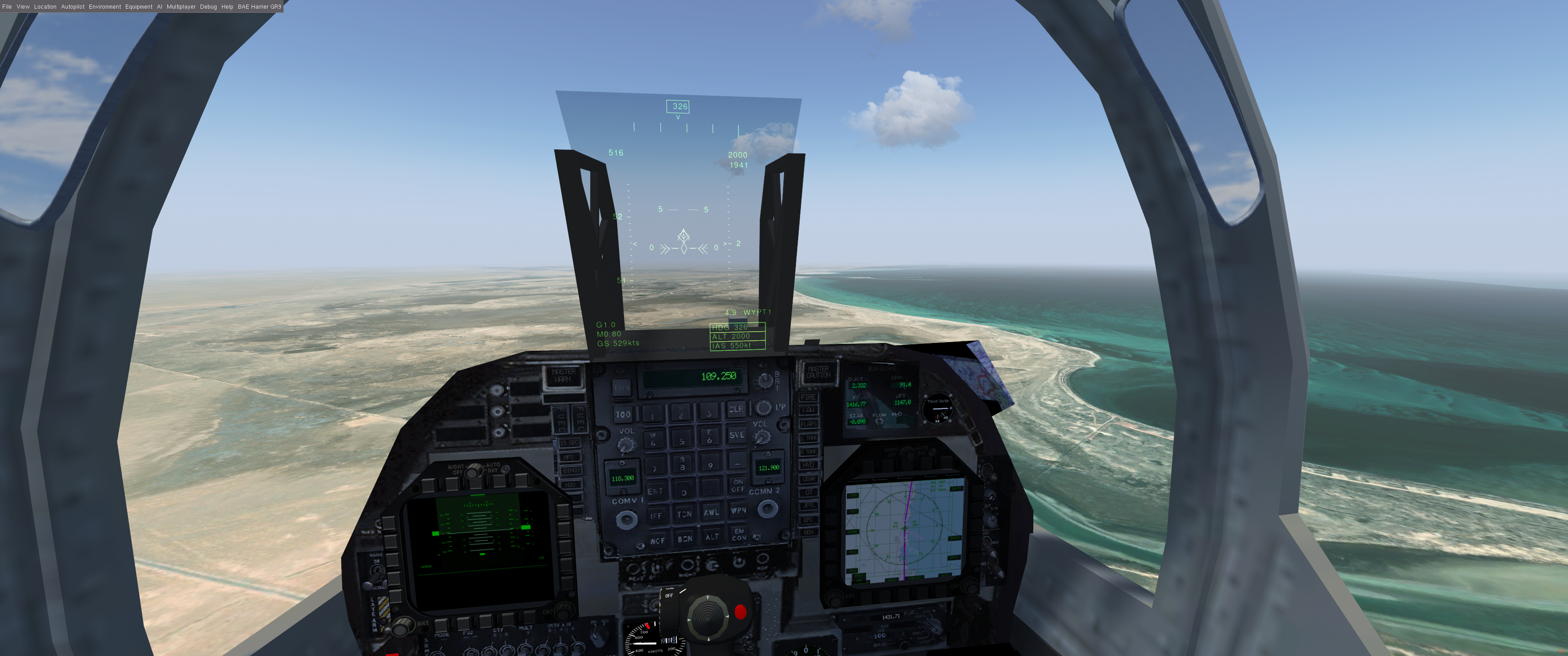 This GR9 doesn't have visible radar yet but it does have a new, almost entirely real world functional MFD, which does a nice job of being an accurate Nav display for many military jets of the late 90's onwards (particularly the Harrier and F-18 on which it's modelled)